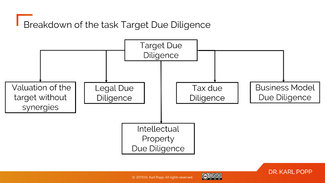 The target is analyzed with regard to various topics. For example, strategic due diligence, GTM due diligence, technical due diligence, operations due diligence, cultural due diligence, intellectual property due diligence, and financial and tax due diligence.