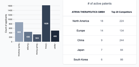 Figure 14: Screenshot of PATEV TechValue: Results by "mouse over" on the map for technological competitors with living patents there. Number of applicant companies per region, Top 20 competitors.